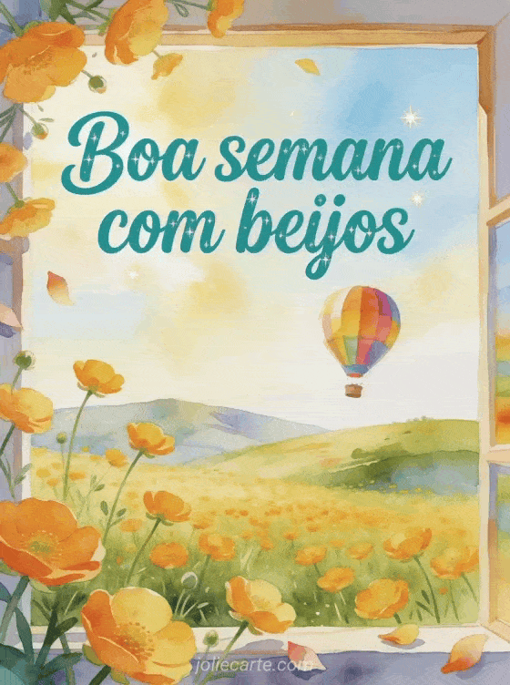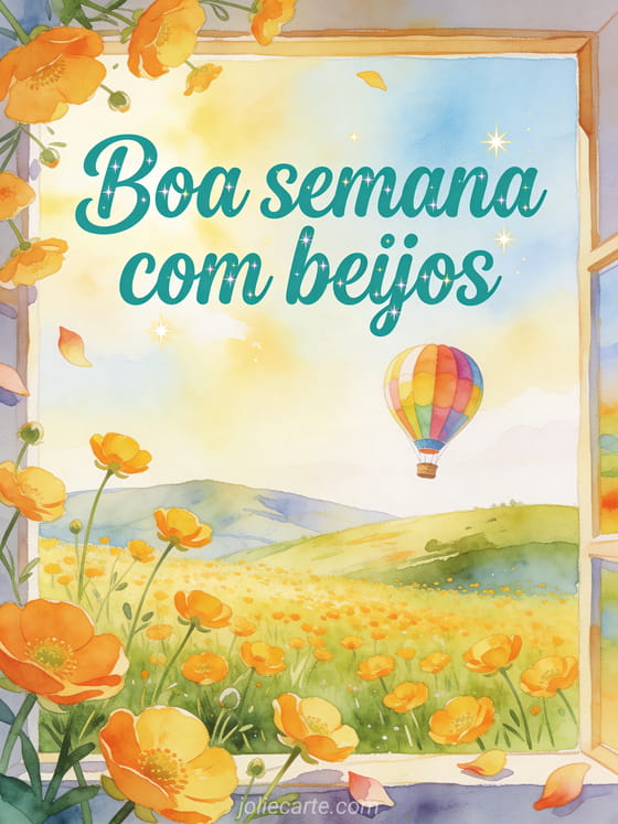 Envie um cartão alegre de boa semana com uma campina de ranúnculos e um balão de ar quente colorido flutuando sobre colinas distantes. Descubra também um boa semana gif beijos, um boa semana para você também beijos ou um boa semana muitos beijos.
