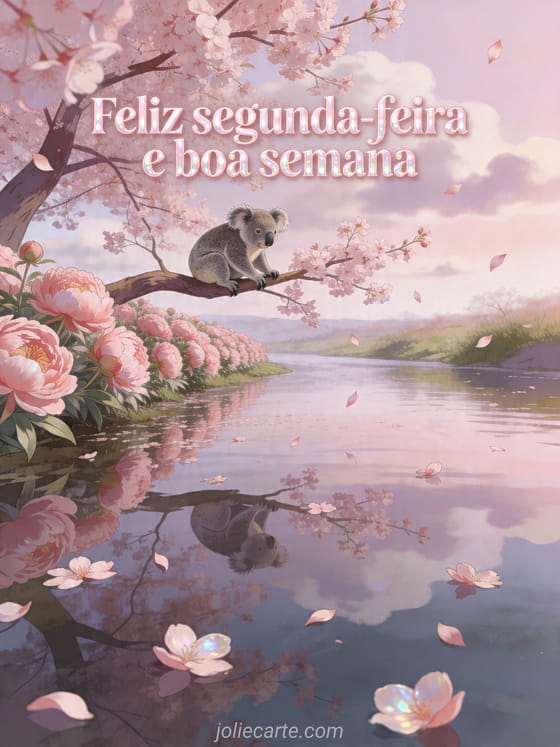 Envie uma poética mensagem de segunda-feira e boa semana com este cartão ilustrado de cerejeiras em flor, peônias rosas e um coala sobre água espelhada. Você também pode descobrir paisagem feliz segunda-feira boa semana paisagem, feliz segunda-feira e boa semana de inverno ou desejar uma feliz segunda-feira e uma boa semana.