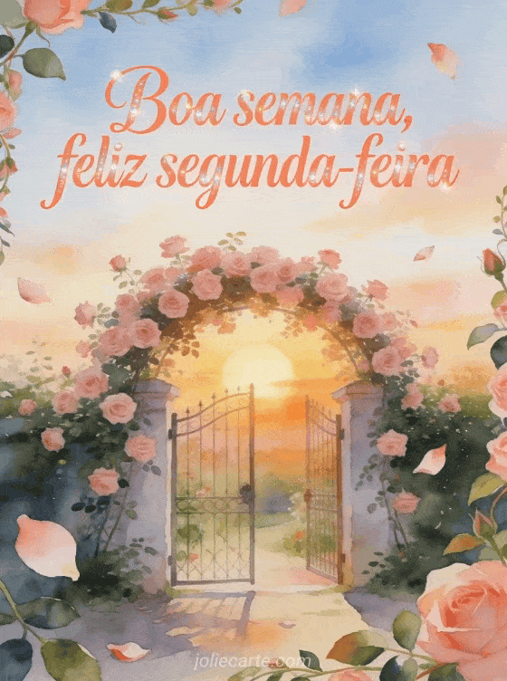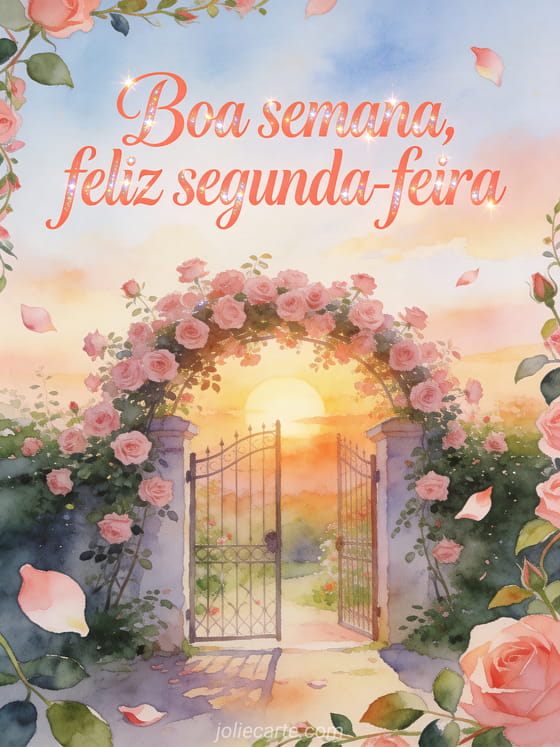 Envie uma mensagem encorajadora de boa semana e feliz segunda-feira com o nascer do sol sobre um pequeno portão de jardim coberto de rosas, pétalas e caules com folhas. Veja também bom dia segunda-feira bom dia imagem, uma feliz segunda-feira imagem animada ou uma imagem feliz segunda-feira força.