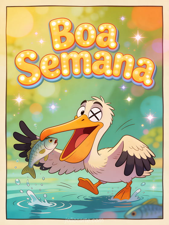Envie um cartão de boa semana com humor animado e faça alguém gargalhar. Um pelicano desajeitado tentando pescar com uma expressão engraçada é o desejo perfeito para uma semana com humor. Descubra também um imagens boa semana ou um gif boa semana humor animado.