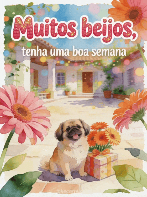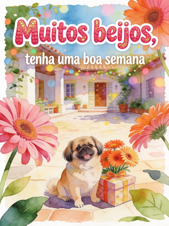 Compartilhe um desejo alegre de boa semana com letras framboesa, um cachorro pekinguês, um presente embrulhado e gérberas brilhantes em um pátio ensolarado. Veja também beijos para a semana toda, boa semana cartão beijos ou coração beijos da semana.