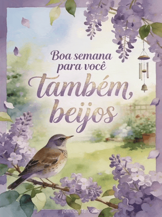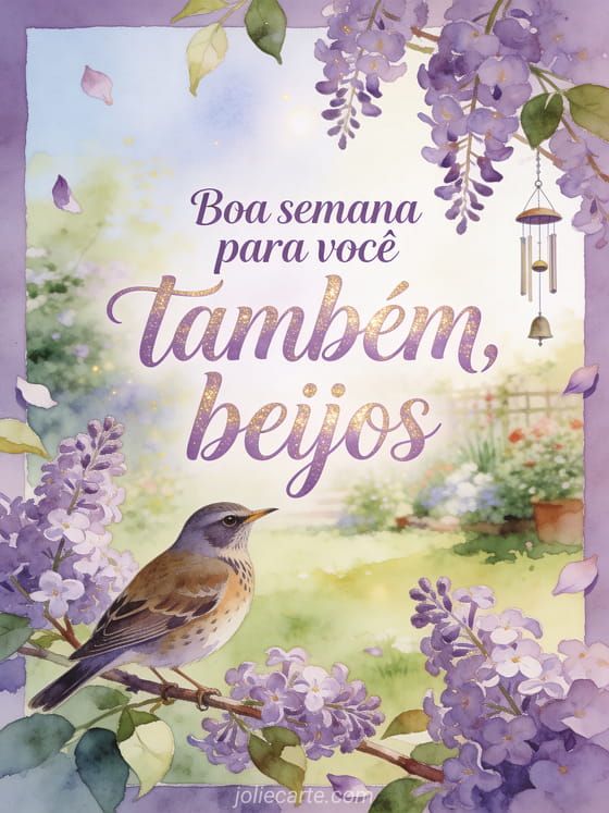 Compartilhe um cumprimento delicado de boa semana com escrita lavanda, um pássaro tordo, ramos de lilás floridos, um sino dos ventos e luz clara de jardim de primavera. Veja também boa semana muitos beijos, beijos para a semana toda ou boa semana cartão beijos.
