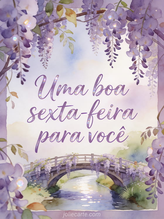Compartilhe uma boa sexta-feira serena com letras lavanda elegantes e brilho perolado. Este cartão grátis mostra uma ponte arqueada sobre um rio estreito coberto por glicínia pendente, com flores em cascata e reflexos luminosos. Veja também feliz sexta-feira e bom fim de semana imagens, um bom dia sexta-feira gif ou um texto de feliz sexta-feira.