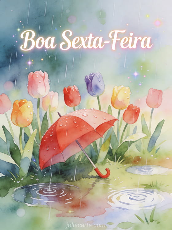Compartilhe uma suave e fresca saudação chuvosa de sexta-feira com tulipas brilhantes e um guarda-chuva vermelho. Descubra também uma paisagem natureza boa sexta-feira ou uma mensagem feliz sexta-feira cartão.