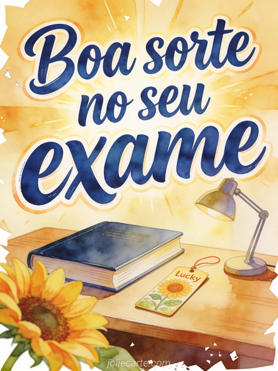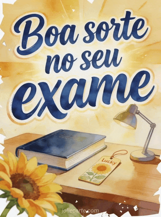 Envie boa sorte exame gifs animados gif com letras cobalto, uma mesa de estudos, um livro fechado, um marcador da sorte, uma lâmpada pequena e um girassol. Veja também uma boa sorte trevo de quatro folhas imagem, um boa sorte novo trabalho cartão ou uma imagem para dizer boa sorte.
