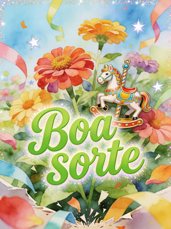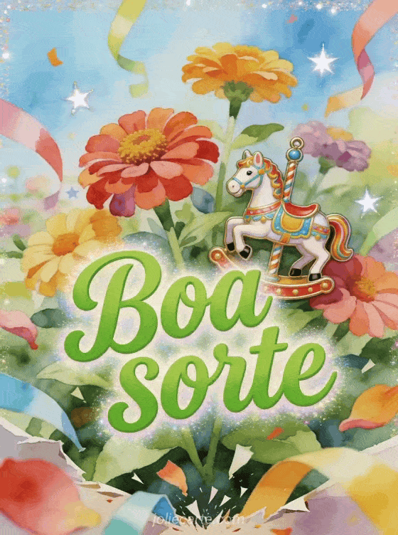 Deseje boa sorte com um brilhante amuleto de cavalo de carrossel, flores de zínia, serpentinas de papel e confete de estrelas em um jardim alegre. Você também pode enviar uma boa sorte concurso imagem, um boa sorte nas suas provas gif ou cartões virtuais boa sorte.