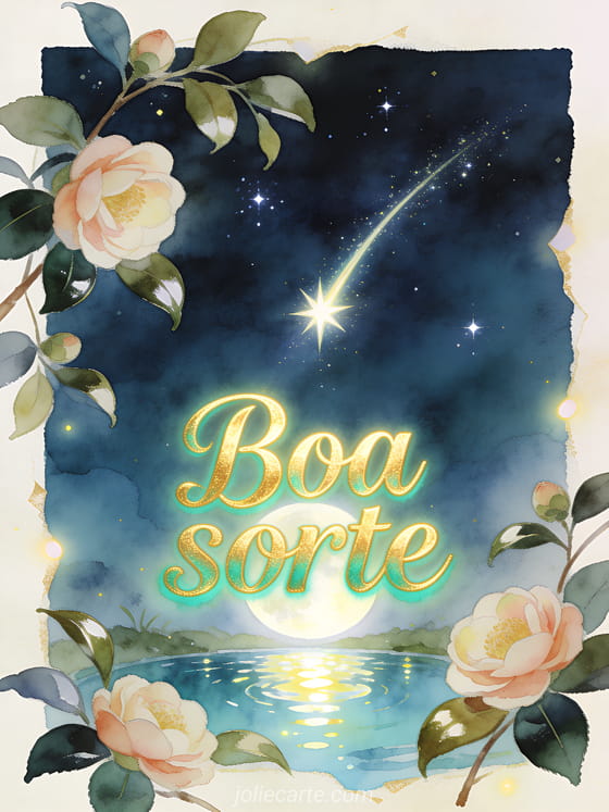 Compartilhe um desejo de boa sorte com uma estrela cadente sobre um lago claro ao luar, reflexos brilhantes, camélias e folhas lustrosas. Veja também votos de boa sorte, boa sorte imagens grátis ou um texto boa sorte para o que vem pela frente.