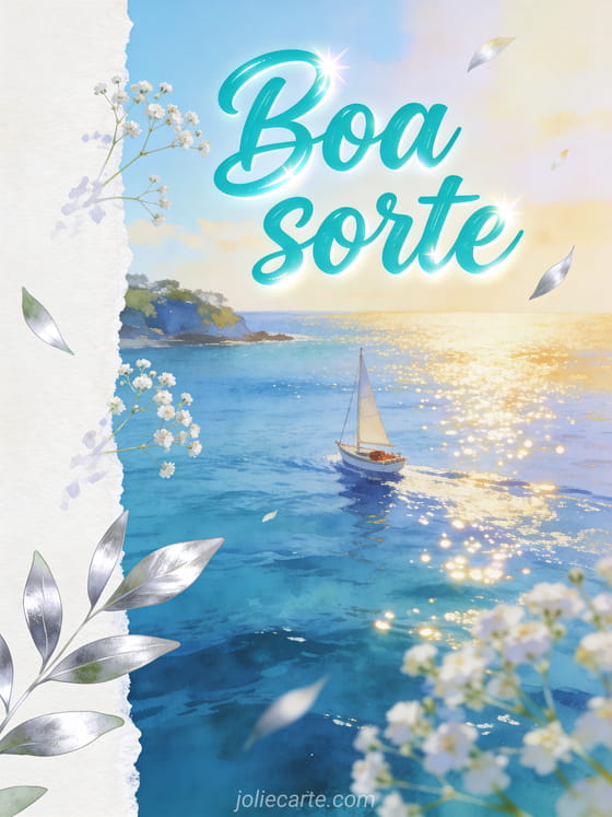 Envie boa sorte com letras turquesa, um pequeno veleiro cruzando uma baía azul brilhante, flores de gipsófila e luz dourada. Veja também mensagem de boa sorte para prova, boa sorte para encontrar colegas melhores do que nós cartão ou boa sorte gifs.