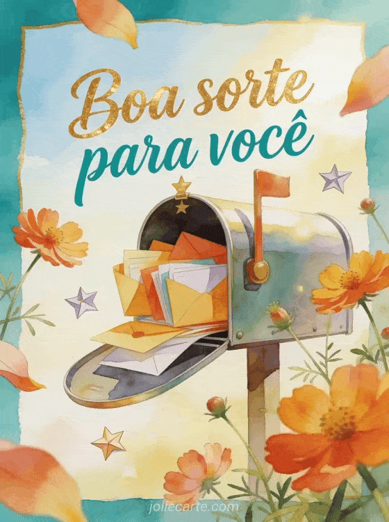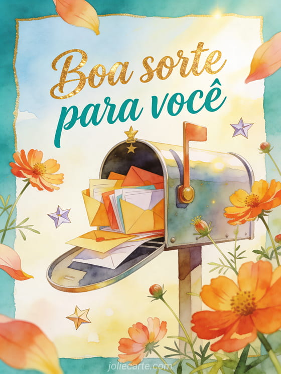 Deseje boa sorte com uma caixa de correio transbordando envelopes brilhantes, flores de cosmos e pequenas estrelas de papel sob uma luz clara da manhã. Você também pode enviar texto boa sorte para o que vem pela frente, e acima de tudo boa sorte gif ou boa sorte imagens.