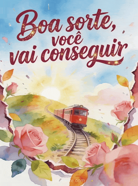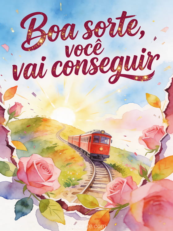Incentive alguém com um cartão de boa sorte em que um trenzinho vermelho sobe uma colina ensolarada, emoldurado por rosas e folhas brilhantes. Veja também um cartão de boa sorte grátis, um cartão de boa sorte ou um boa sorte na sua prova texto.