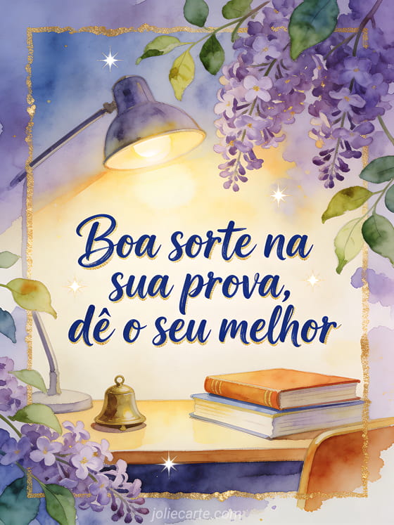 Incentive alguém antes da prova com caligrafia índigo nítida, reflexos dourados, uma mesa de estudos luminosa, livros fechados, um pequeno sino de latão, lilás, folhas frescas, luz quente de luminária e cores claras. Você também pode enviar boa sorte gifs animados grátis, uma mensagem para desejar boa sorte em um exame ou uma mensagem de boa sorte para um novo trabalho.
