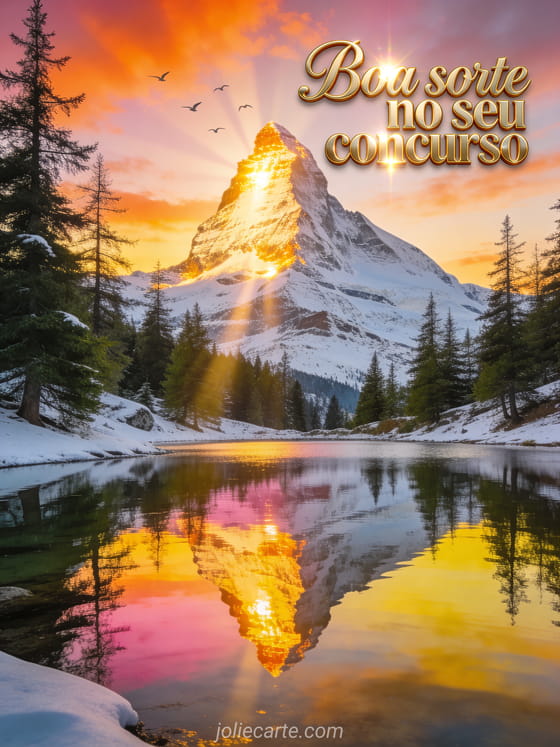 Inspire alguém antes do concurso com este cartão grandioso com uma montanha nevada ao nascer do sol, um lago espelho e pássaros em voo. Descubra também um cartão boa sorte provas, um cartão boa sorte estudos ou um cartão boa sorte prova.