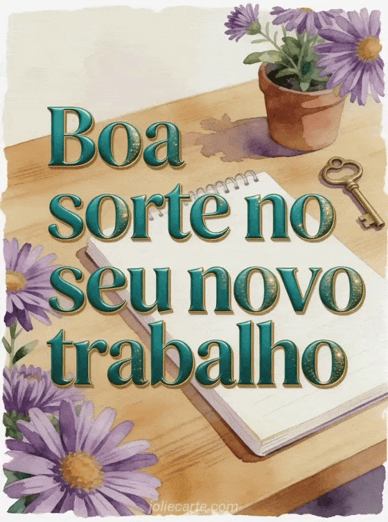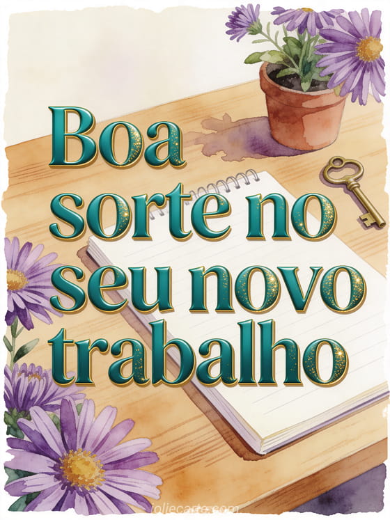Compartilhe boa sorte para um novo trabalho com uma mesa de carvalho organizada, um caderno novo, uma pequena planta, uma chave de latão e ásteres roxos. Veja também uma imagem para dizer boa sorte, um texto para desejar boa sorte em uma prova ou boa sorte gifs animados.