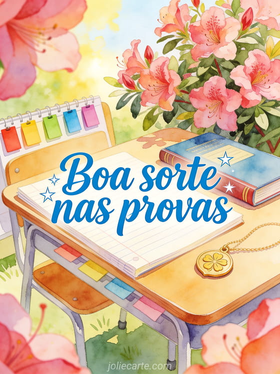 Encoraje alguém antes das provas com este cartão em aquarela, com uma mesa de estudo alegre, divisórias coloridas, um manual fechado, um amuleto e flores de rododendro ao sol. Veja também boa sorte para o que vem pela frente imagem, boa sorte gato imagem ou boa sorte gif animado grátis.