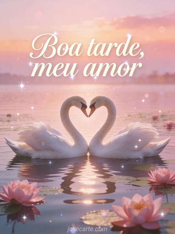 Envie esta romántica boa tarde meu amor com dois cisnes formando um coração num lago tranquilo com nenúfares rosas refletidos na suave luz do pôr do sol. Descubra também um cartão boa tarde muitos beijos imagem ou um cartão desejar boa tarde imagem.
