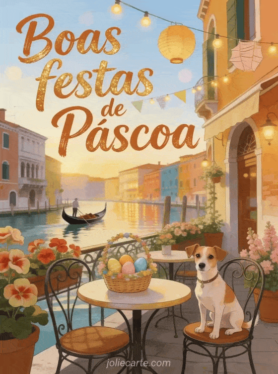 Envie uma bela imagem de boas festas de Páscoa com uma terraça à beira do canal veneziano cheia de ovos pintados. Descubra também um mensagem feliz Páscoa ou um feliz Páscoa gif animado.