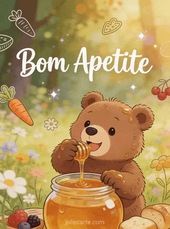 Envie este adorável desenho de bom apetite com um filhote de urso lambendo mel de uma grande panela em um prado ensolarado. Descubra também um cartão bom apetite imagem ou um cartão humor engraçado bom apetite.