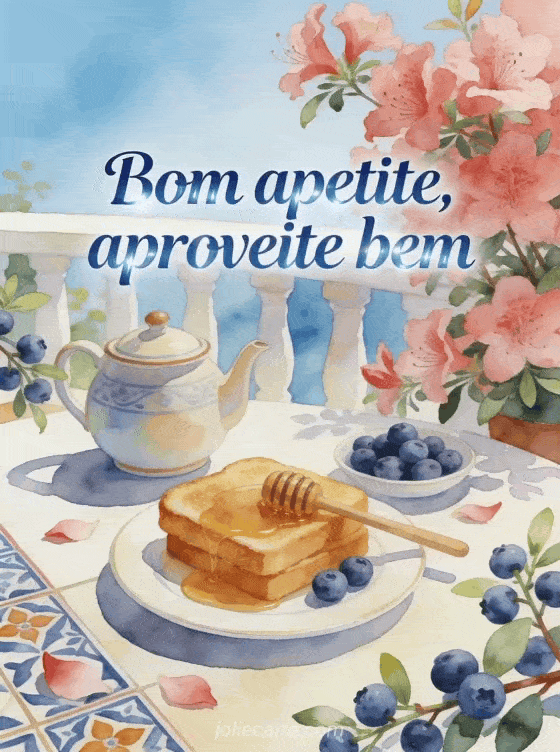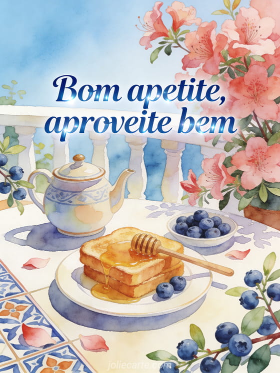Envie um cartão de bom apetite com um terraço iluminado, bule de cerâmica, torrada com mel, mirtilos e flores de azaleia. Veja também um bom apetite para compartilhar no Facebook, um sms para dizer bom apetite ou um bom apetite.