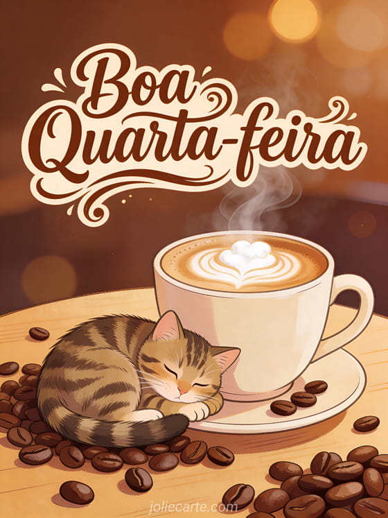 Alegre a quarta-feira de alguém com este caloroso cartão de café com um adorável gato tigrado enrolado junto a uma xícara de latte. Descubra também emoji boa quarta-feira ou quarta-feira beijos gifs.