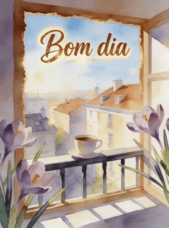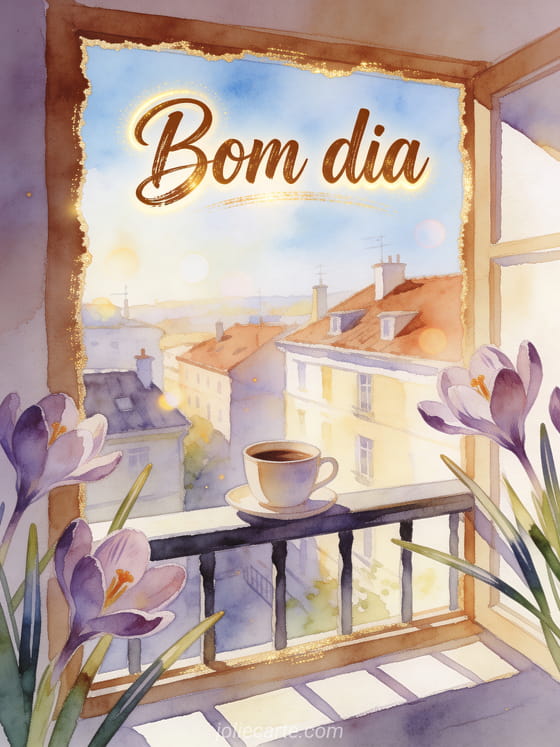 Compartilhe um bom dia fresco com letras sépia, pétalas de crocus, uma xícara de café no parapeito de uma varanda e telhados claros sob um céu de manhã. Veja também bom dia o café está servido, bom dia café de inverno ou carinho bom dia café beijos.