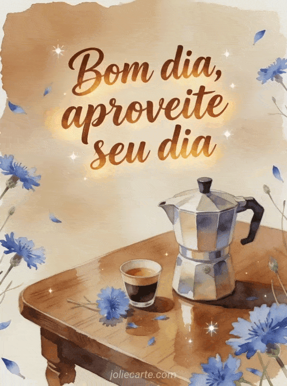 Comece o dia com letras quentes em aquarela, uma cafeteira, uma xícara pequena e centáureas azuis sobre uma mesa de madeira polida. Veja também um cartão de bom dia café beijos gif, um cartão de bom dia café coração gif ou um cartão de bom dia café mensagem.