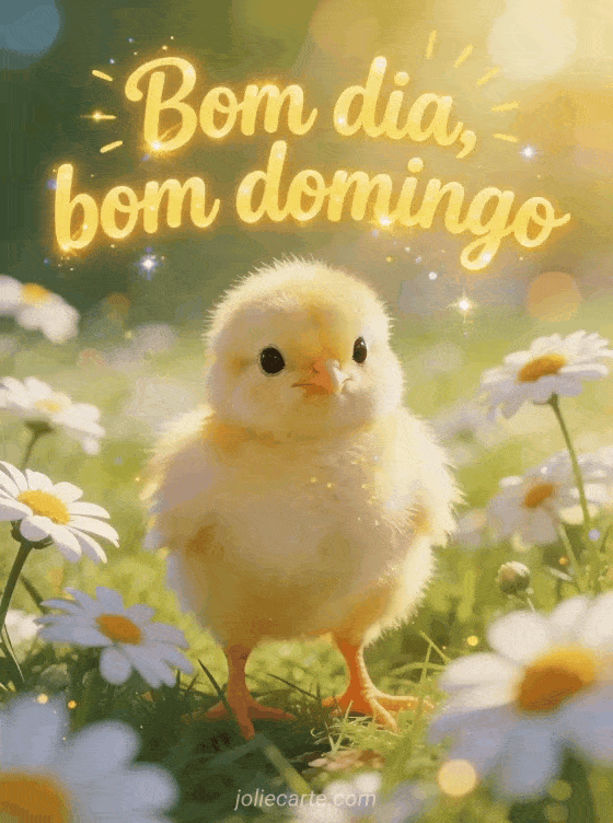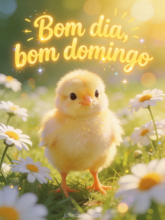 Compartilhe um gif de bom dia bom domingo com letras amarelas alegres, efeito de sol, um pintinho fofinho em pé entre margaridas e uma atmosfera fresca de manhã de primavera. Veja também bom dia bom domingo cartão ou bom domingo ensolarado beijos.
