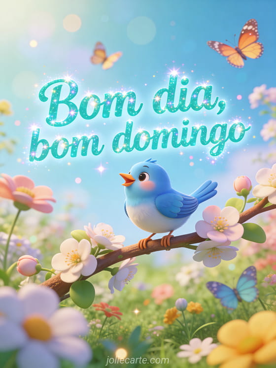 Compartilhe uma saudação luminosa de domingo de manhã com um chapim-azul fofo cantando em um galho florido, flores de primavera e borboletas dançando. Você também pode enviar feliz domingo e bom dia ou bom domingo descanso.