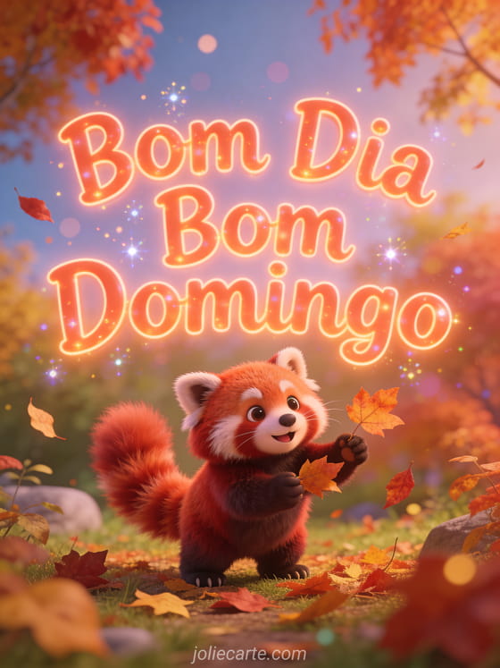 Envie uma alegre saudação de domingo com um adorável panda vermelho brincando com folhas de outono em um cenário colorido. Uma forma divertida de desejar um maravilhoso domingo. Descubra também um cartão mágico de domingo ou um cartão domingo ensolarado.