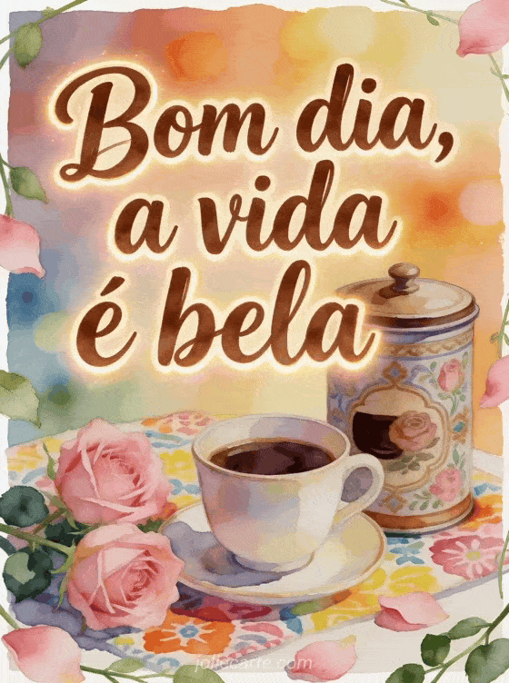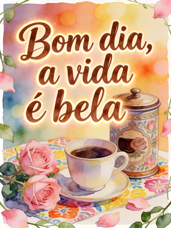 Compartilhe um lembrete luminoso da manhã: a vida é bela, com uma lata de café decorativa, uma xícara e rosas rosadas sobre um tecido estampado alegre. Você também pode enviar gifs de bom dia com café, bom dia café ternura ou bom dia café citação.