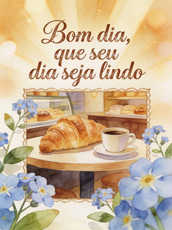 Bom dia, que seu dia seja lindo um carinho de manhã com café, croissant e miosótis