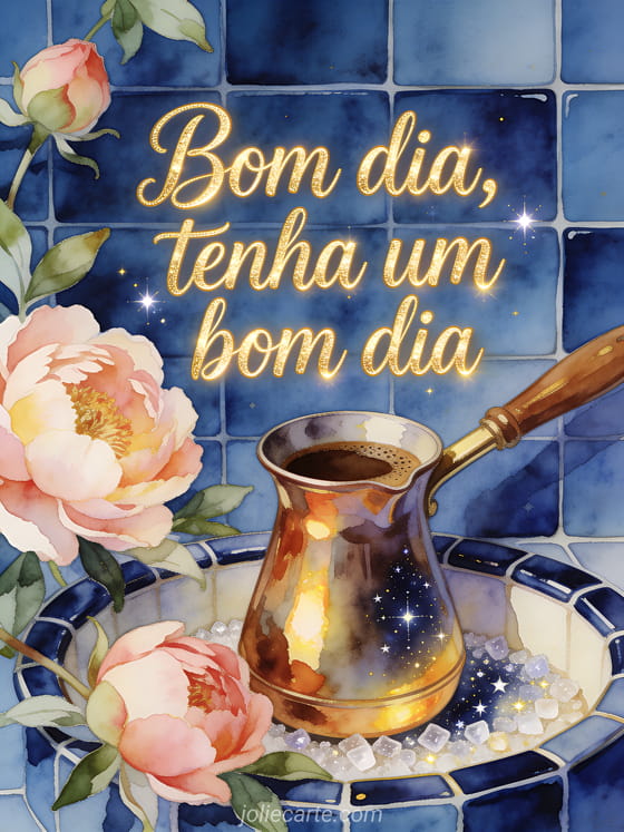 Envie um caloroso cartão de bom dia com uma elegante cafeteira e cristais de açúcar sobre azulejos azuis, cercados por pétalas de peônia. Descubra também um bom dia café janeiro, um bom dia café coração ou um bom dia chá ou café.