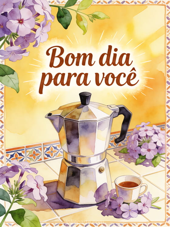 Compartilhe um cartão caloroso de bom dia com café, uma cafeteira moka polida, uma xícara pequena, flores phlox e azulejos estampados de cozinha sob luz dourada. Você também pode enviar uma imagem de bom dia com café, um bom dia com café gif animado ou um bom dia bom café gif.