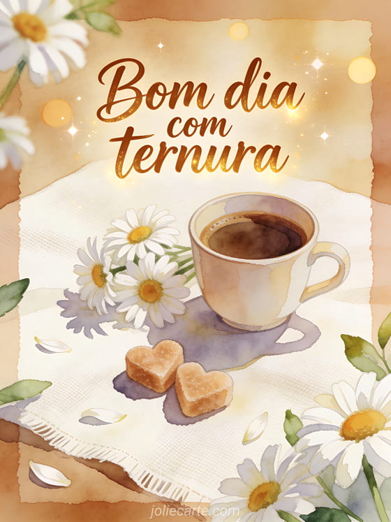 Compartilhe um desejo suave de manhã com letras castanhas em aquarela, uma xícara de café, margaridas, cubos de açúcar em forma de coração, linho claro e bokeh brilhante. Veja também um cartão de bom dia café citação, um cartão de gif brilhante de bom dia com café ou um cartão de café bom dia minha querida.