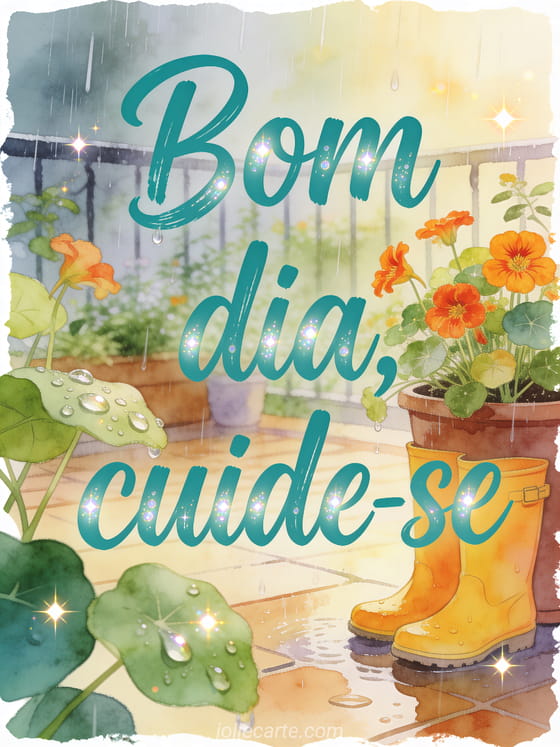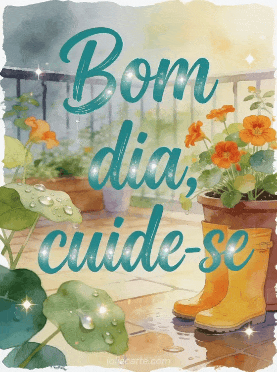 Compartilhe um bom dia chuvoso com letras em tom turquesa, gotas brilhantes e um jardim acolhedor. Este cartão grátis ajuda você a enviar cuidado e lembrar alguém de se cuidar. Veja também um bom dia chuvoso, um beijinhos gif bom dia beijinhos te amo ou um beijos lindo dia gif.