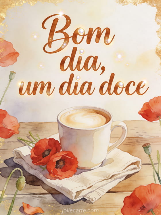 Compartilhe um bom dia doce com uma caneca cremosa de cappuccino, papoulas vermelhas, um guardanapo de linho dobrado e uma mesa de madeira rústica. Veja também bom dia bom café gif, bom dia meu coração café ou bom dia café café.