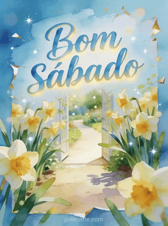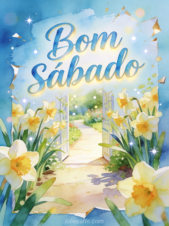 Envie uma imagem de bom dia de sábado com letras azul-céu, narcisos e um caminho de jardim iluminado. Você também pode compartilhar imagens gif feliz sábado, um cartão de bom dia e feliz sábado ou fotos bom sábado.