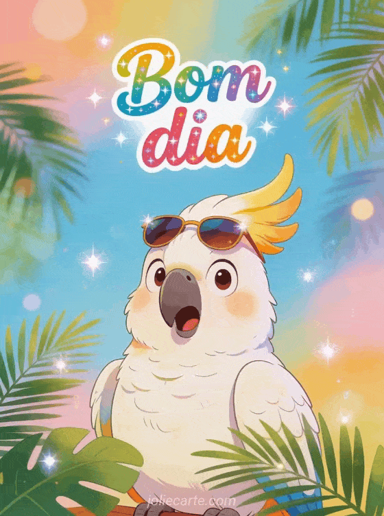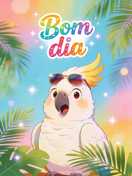 Compartilhe uma saudação divertida de bom dia com letras coloridas, brilhos e uma cacatua engraçada com expressão surpresa usando óculos minúsculos entre folhas de palmeira tropicais. Veja também um cartão de feliz sexta-feira de manhã com café, um cartão de bom dia sexta-feira paisagem ou imagens de feliz sexta-feira.