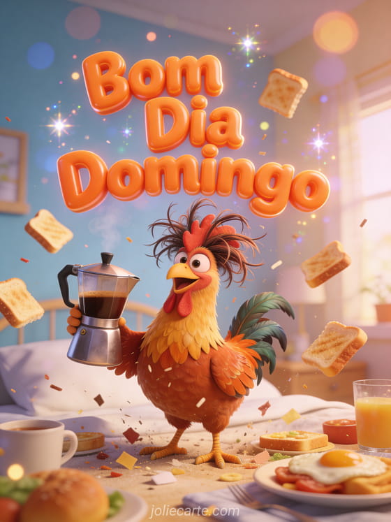 Envie uma divertida saudação de bom dia domingo com um hilário galo de desenho animado com penas despenteadas e um bule de café. Uma forma engraçada de começar o domingo de alguém com risadas. Descubra também um cartão terno de domingo ou um cartão bom domingo.