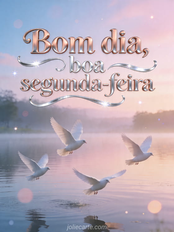 Compartilhe um cartão sereno de Bom dia, boa segunda-feira com pombas brancas sobre um lago calmo ao amanhecer. Veja também força engraçada boa segunda-feira, bom dia segunda-feira e boa segunda-feira boa semana engraçado.