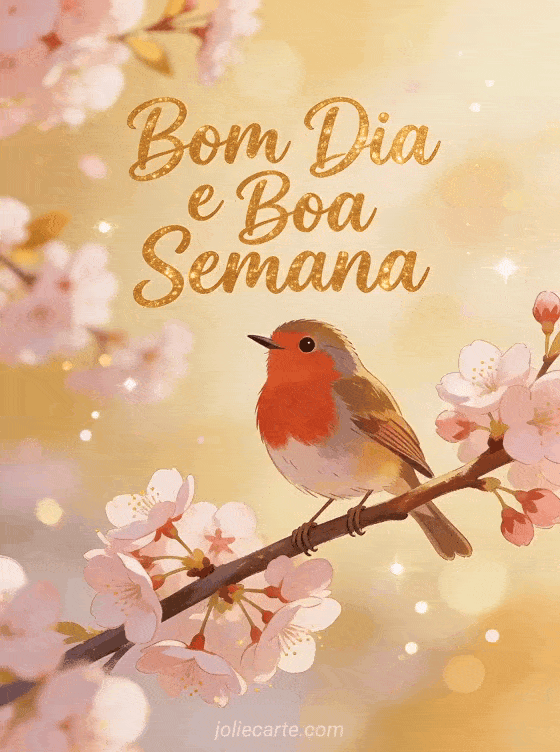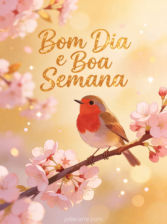 Comece a semana com uma nota iluminada para as pessoas que você ama com este caloroso cartão com um alegre pintarroxo pousado em um galho de cerejeira em flor sob uma suave luz da manhã. Descubra também um cartão de boa semana ou um cartão de boa semana e coragem.