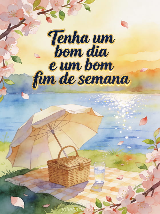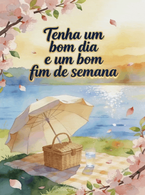 Compartilhe uma mensagem tranquila de bom dia e bom fim de semana com um piquenique à beira do lago, guarda-sol de lona, cesto de piquenique e flores de cerejeira em aquarela. Veja também bom dia lindo dia beijos gif, bom dia natureza gif ou gifs de bom dia e tenha um bom dia.