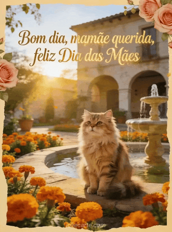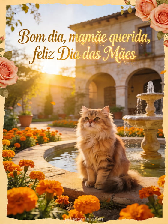 Compartilhe um cartão radiante de manhã de Dia das Mães com um gato persa, cravos-de-defunto dourados, uma pequena fonte e detalhes do nascer do sol. Veja também verso do Dia das Mães, mensagem de feliz Dia das Mães ou cartões do Dia das Mães.