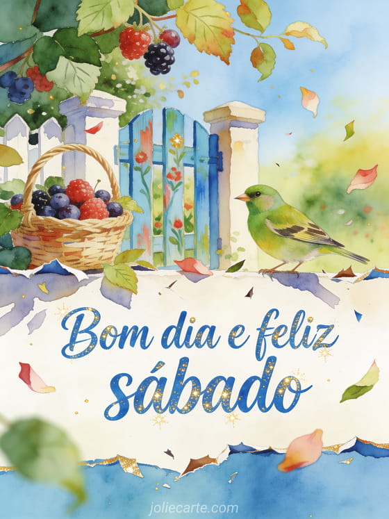 Envie bom dia e feliz sábado gifs com letras azuis frescas, um verdilhao pousado junto a um portão de jardim pintado, uma cesta de frutas vermelhas maduras e folhas cruzando a borda. Você também pode gostar desta feliz sábado minha amiga imagem, desta feliz sábado romântico imagem ou destas feliz sábado bom fim de semana imagens.