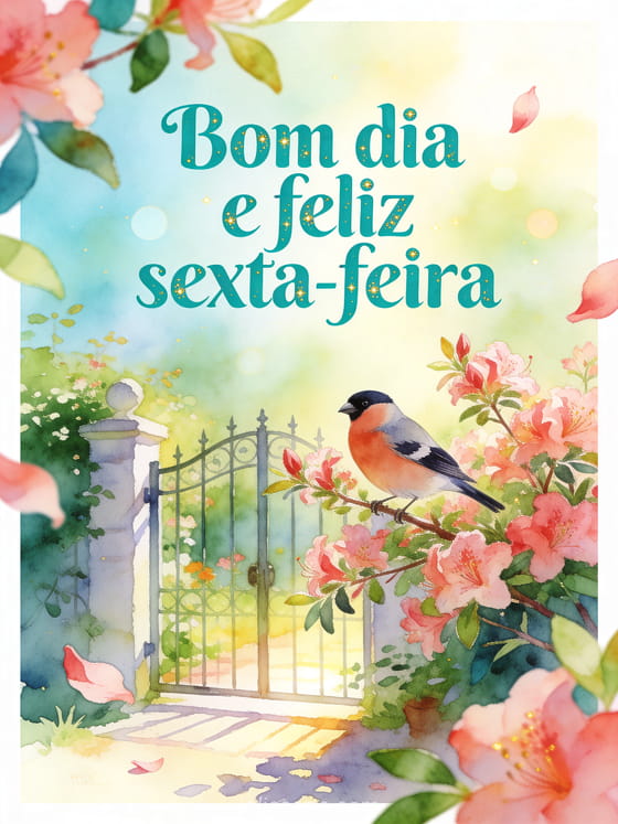 Compartilhe uma manhã positiva de sexta-feira com este cartão em aquarela, onde um dom-fafe pousa entre azaleias perto de um portão de jardim. Veja também feliz sexta-feira minha querida imagens, feliz sexta-feira gato imagem ou feliz sexta-feira a todos imagem.