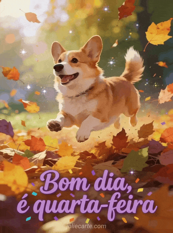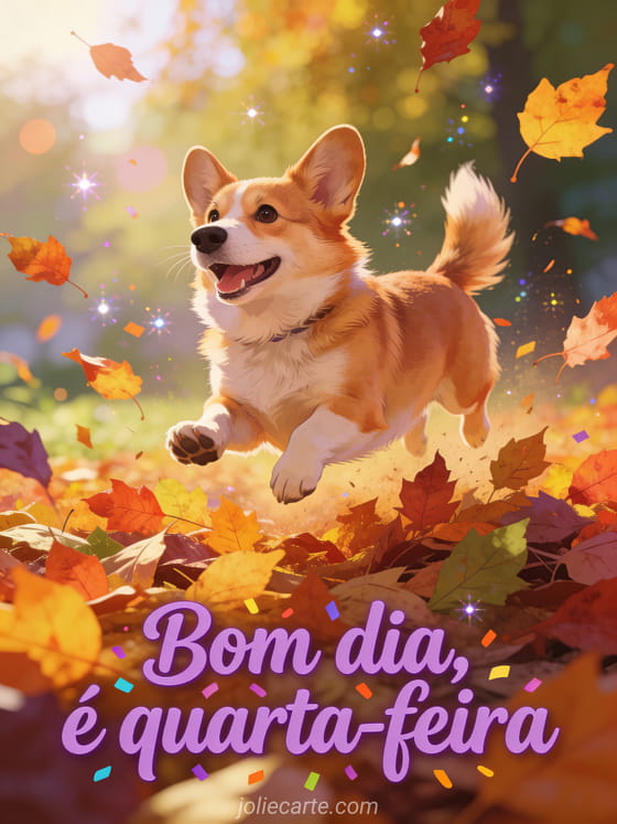 Envie uma saudação alegre de bom dia quarta-feira com um corgi feliz saltando entre folhas coloridas de outono sob uma luz quente. Veja também uma bom dia minha linda quarta-feira, uma bom dia feliz quarta-feira imagem ou um feliz quarta-feira flores gifs.