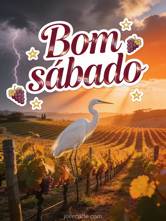 Envie um bom sábado caloroso com um vinhedo de Napa Valley, fileiras douradas de videiras, stickers de uvas e uma majestosa garça-branca pousando sob luz alaranjada do pôr do sol. Veja também gifs de feliz sábado para amigos, amizade feliz sábado bom fim de semana ou bom dia feliz sábado beijos.