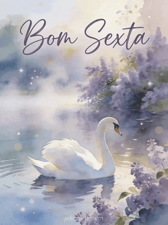 Comece a sexta-feira de forma bonita com este elegante cartão com um gracioso cisne branco deslizando num lago de neblina rodeado de lilas. Veja também um gif feliz sexta-feira ou feliz sexta-feira gif humor.