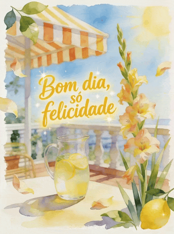 Deseje um bom dia cheio de felicidade com um terraço luminoso em aquarela, um toldo listrado, uma jarra de limonada, gladíolos e calor ensolarado de primavera-verão. Veja também um cartão de lindas imagens bom dia tenha um bom dia, bom dia e bom fim de semana imagens ou bom dia lindo dia beijos gif.