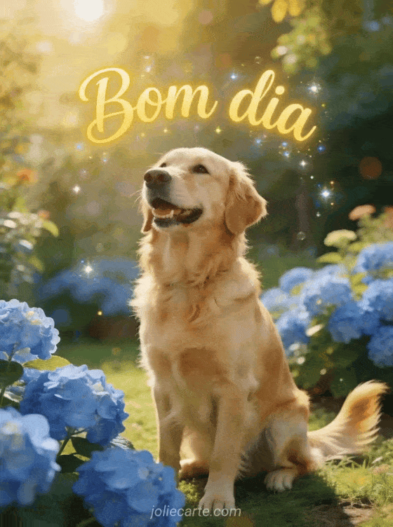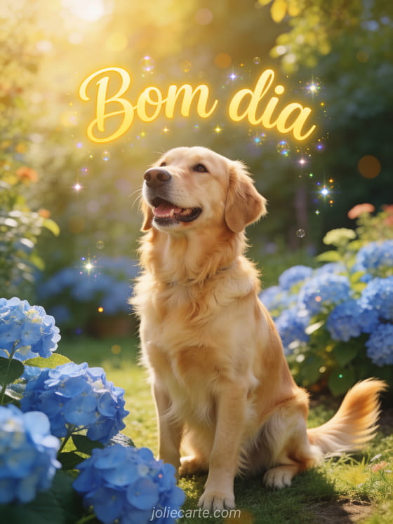 Compartilhe uma saudação luminosa de bom dia com um golden retriever feliz em um jardim ensolarado de hortênsias azuis. Veja também um linda imagem de feliz sexta-feira, um boa sexta-feira sol gif ou um boa sexta-feira imagem com flores.