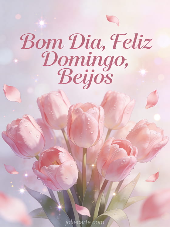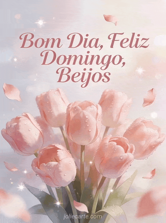 Comece o domingo de alguém com ternura e carinho com este romântico cartão com um lindo buquê de tulipas rosas com orvalho matinal. Descubra também um cartão feliz domingo gif engraçado, um cartão imagens feliz domingo beijos ou um cartão olá bom domingo beijos.